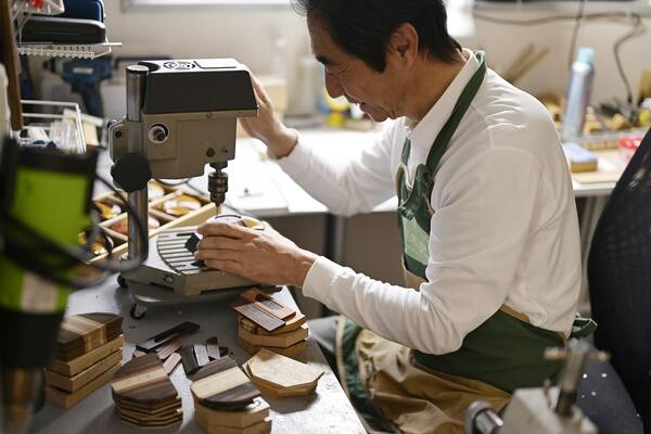 還暦祝い、古希祝い、退職祝いなどそれぞれのお祝い事に相応しい木を厳選し、箱根伝統工芸士作の「寄せ木細工」を装飾した木製パターをハンドメイドで製作します。