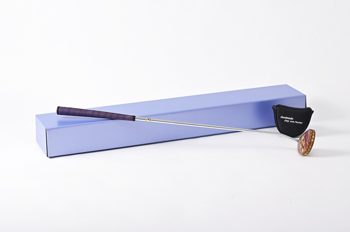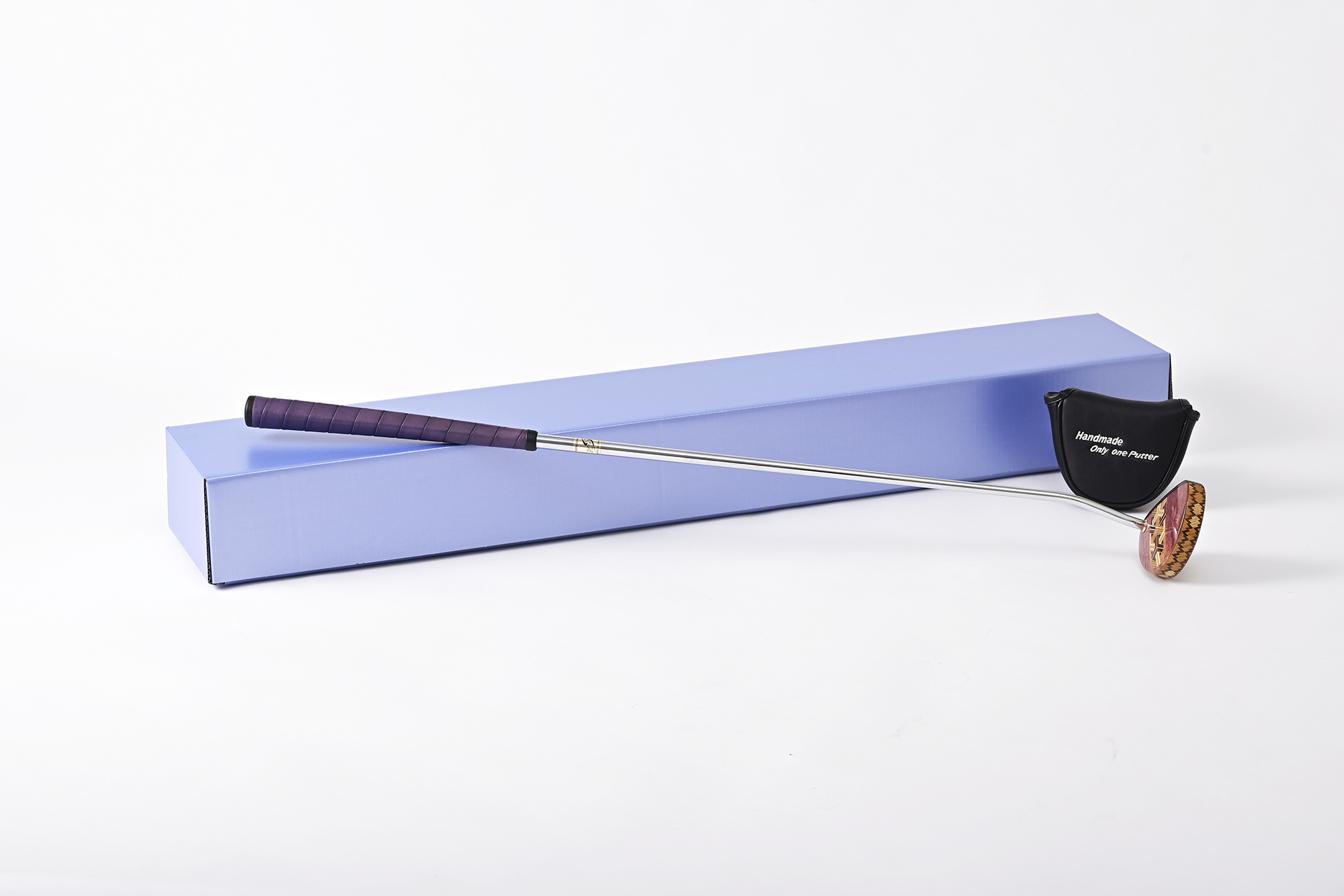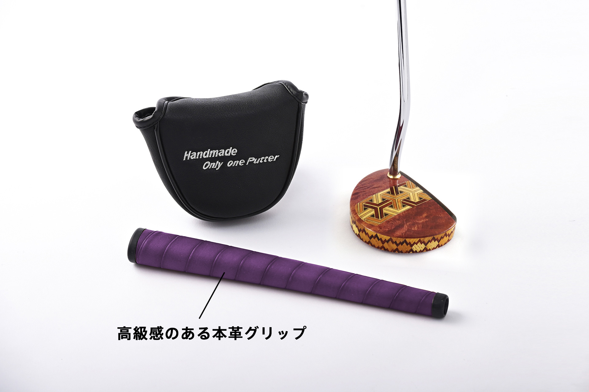 商品は、パター本体に付属のヘッドカバー、ネームプレート作成の3点セットになります。グリップは紫色の本革製のグリップを使用。 さらにそのままプレゼントしていただけるよう、オリジナルの化粧箱に入れて商品を発送させて頂きます。
